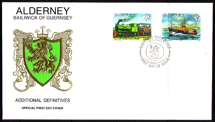 ALDERNEY MI-NR. 59-60 FDC ANSICHTEN - LOKOMOTIVE mit EISENBAHN - SEENOTRETTUNGSKREUZER